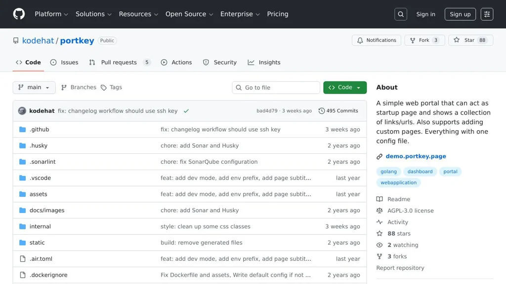 Portkey is a lightweight, self-hosted web portal written in Go. It acts as a startup page that displays a collection of links and supports simple custom pages. It is configured from a single YAML file and can be run with Docker.
