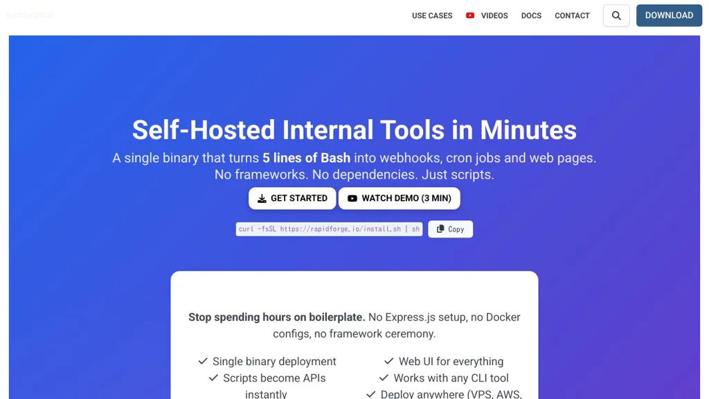 RapidForge is a single-binary web server that turns scripts into production-ready internal tools, APIs, webhooks and scheduled jobs. It provides a web UI and visual page builder so teams can expose CLI tools and scripts as endpoints or pages without framework boilerplate.