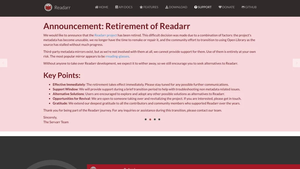 Readarr fits well in a Servarr-style media automation stack where you want hands-off discovery, downloading, and library organization for books. It is best suited for users comfortable with indexers and download client workflows and who can account for its retired project status.