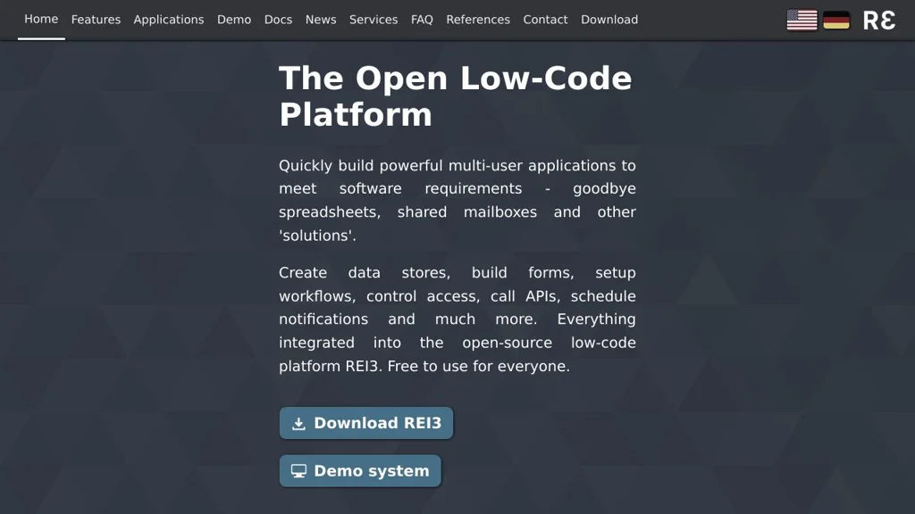 REI3 is an open-source low-code platform for building, running, and maintaining multi-user business applications. It combines app modeling (data, forms, logic) with operational features such as access control, automation, and integrations, designed for self-hosted deployments.