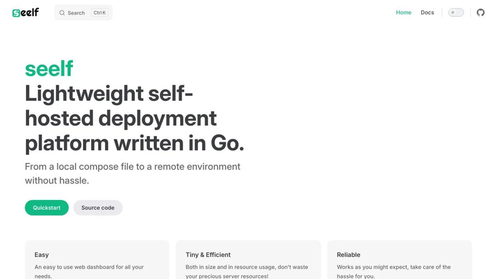 seelf is a lightweight self-hosted deployment platform written in Go that turns Docker Compose files into running services with a minimal web dashboard. It focuses on making it easy to take a local compose file and deploy it to a remote Docker host with sensible defaults and URL exposure.