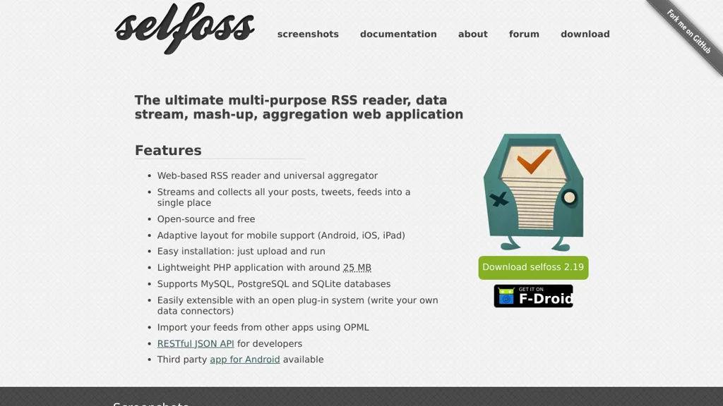 selfoss is a practical choice for users who want a straightforward, web-based feed reader with database flexibility and an integration-friendly API. Its plug-in system and OPML import make it adaptable for both simple and more customized aggregation workflows.