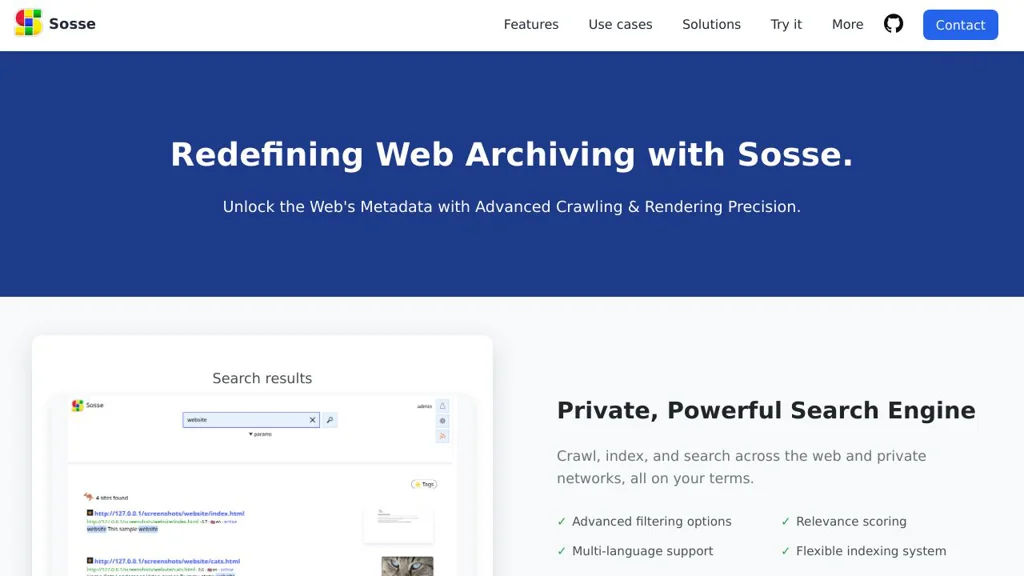 Sosse is an open-source search engine and web crawler designed to index, archive, and monitor web pages — including JavaScript-heavy sites — using browser-based rendering. It combines full-page archiving with flexible crawling policies and search capabilities for private or organizational use.
