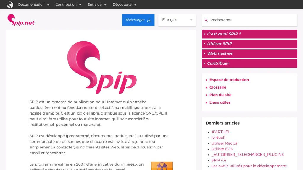 SPIP is a free and open source content management system (CMS) created for publishing websites with a strong focus on ease of use, multilingual content, and collective editorial work. It is widely used for institutional, community, personal, and small commercial sites.