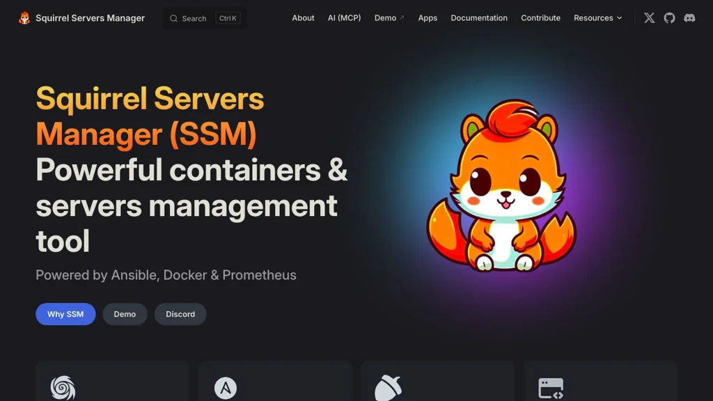 Squirrel Servers Manager (SSM) is an all-in-one, UI-focused tool for managing servers, configurations, and containers. It is designed to be agentless and operates over SSH, combining Ansible-driven configuration automation with Docker management and monitoring.