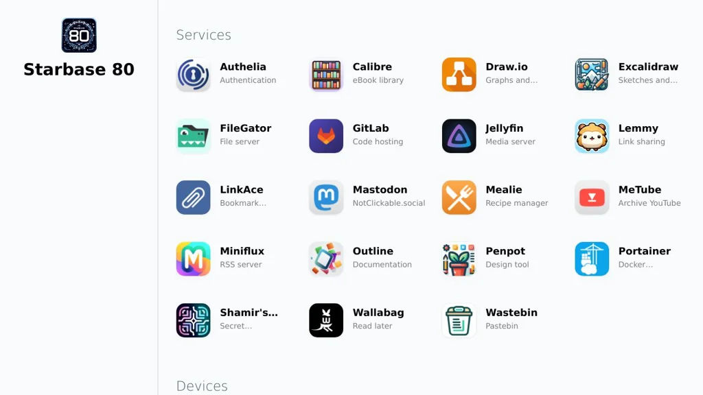 Starbase 80 is a lightweight homepage for organizing links to your self-hosted services, devices, and other resources. It is configured via a simple JSON file and focuses on fast load times and a clean UI, rather than deep integrations.