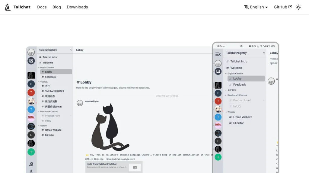 Tailchat is an open source “noIM” (not only instant messaging) team collaboration app that combines chat with an extensible platform for integrating tools and workflows. It supports multi-group workspaces, panels for organizing topics, and a plugin-centered approach for customization.