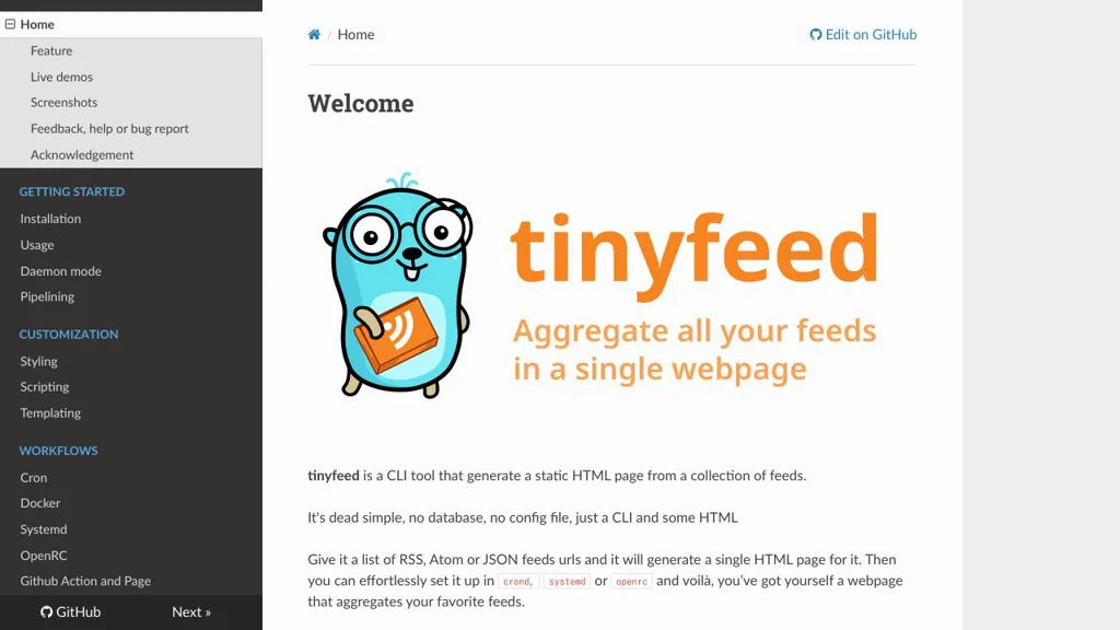 tinyfeed is suited for users who want a minimal, maintainable feed aggregation page without running a full application server. Its simple CLI and template support make it easy to integrate into existing automation or hosting workflows.