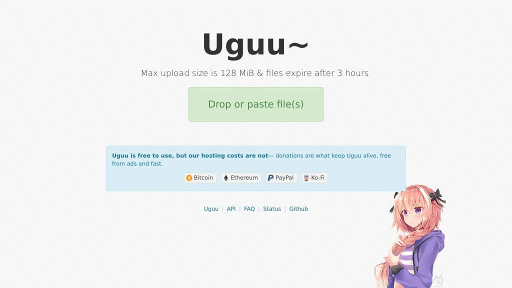 Uguu is a simple, lightweight file hosting service focused on fast temporary uploads and sharing. It provides a minimal web interface for quick uploads and an API for automation, and can also be configured for more permanent hosting.