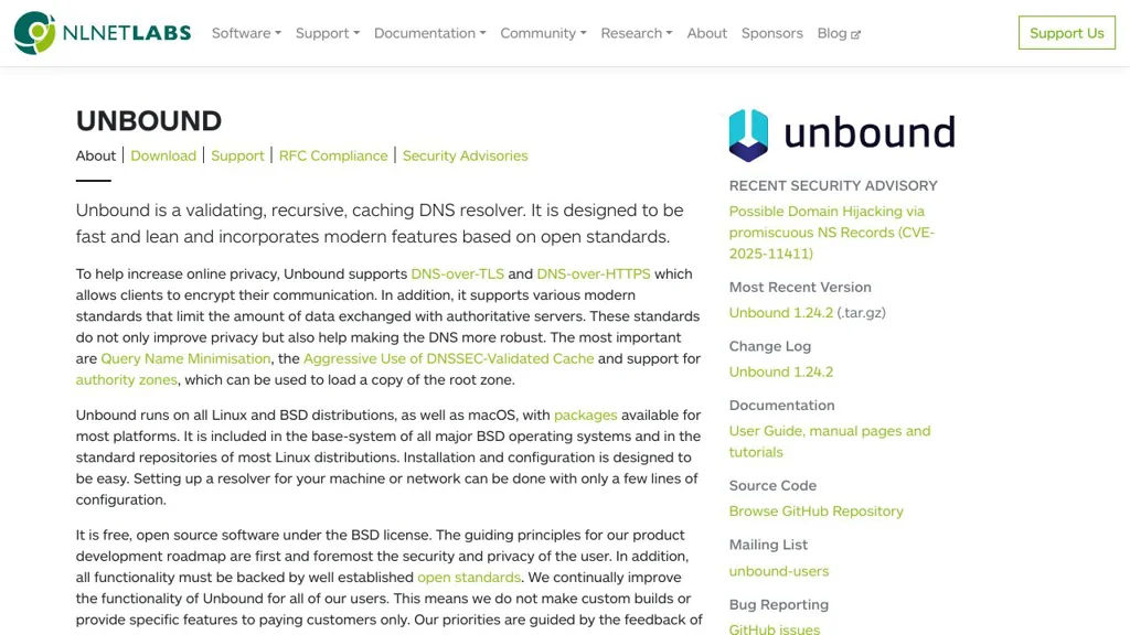 Unbound is a mature, open-source DNS resolver maintained by NLnet Labs with an emphasis on security, privacy and standards compliance. It is widely packaged for major Unix-like distributions and is suitable for both personal and operator-scale resolver deployments.