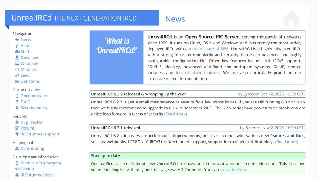 UnrealIRCd is an open-source Internet Relay Chat (IRC) server designed for modularity, security, and high configurability. It implements modern IRCv3 features, supports TLS and WebSocket listeners, and includes advanced anti-spam and anti-flood systems for network operators.
