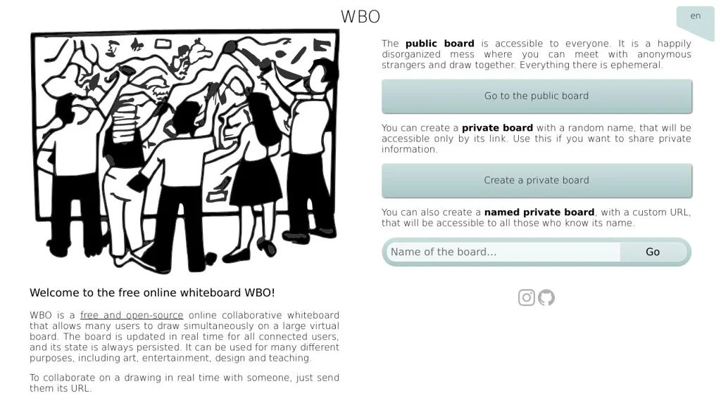 WBO is a simple, lightweight online collaborative whiteboard that lets multiple users draw together on the same board in real time. Boards are automatically persisted so sessions can be revisited later, making it suitable for ad-hoc collaboration or ongoing work.