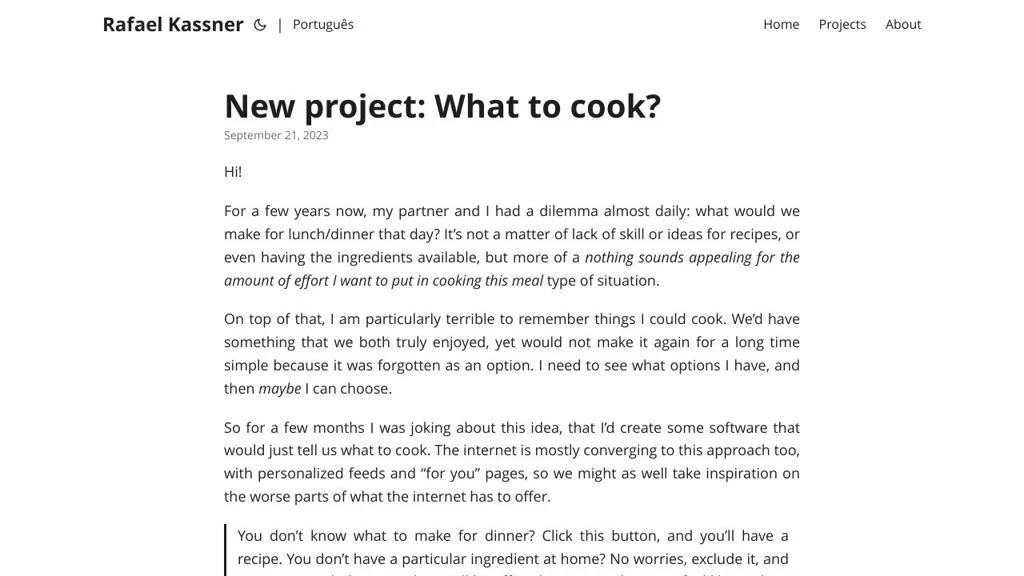 What to Cook? is best suited for users seeking a minimal, self-hostable tool to turn available ingredients into an immediate recipe suggestion. Its small, editable codebase and Docker support make it practical for customization and experimentation.