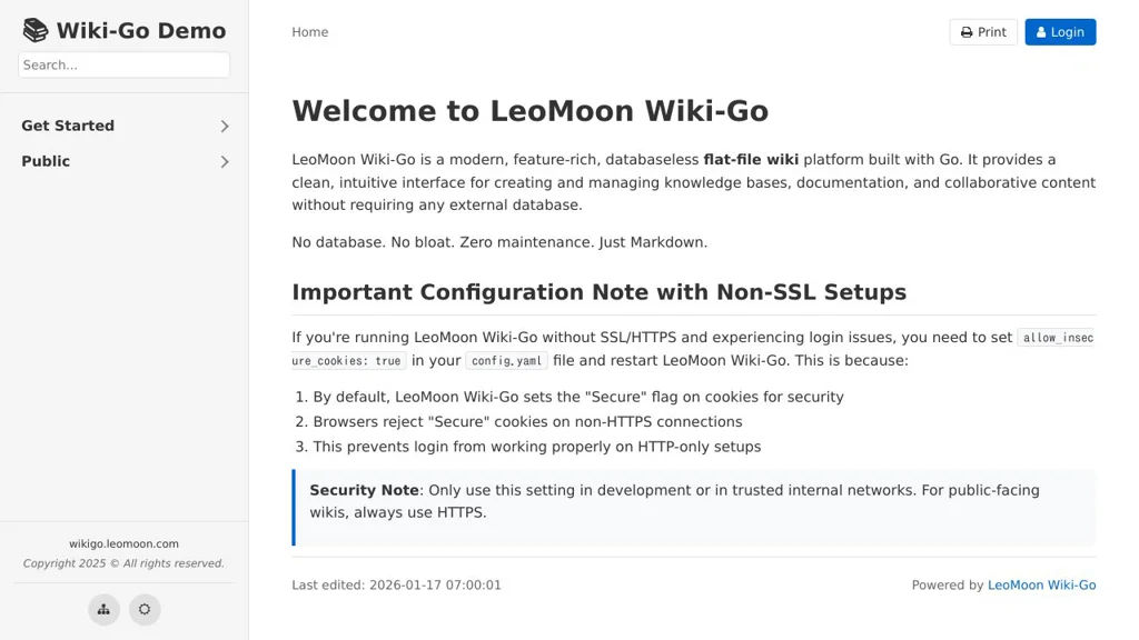 Wiki-Go is a modern, databaseless flat-file wiki platform built with Go. It stores content as Markdown in a flat-file structure and offers features for knowledge bases, documentation, and collaboration without requiring an external database.
