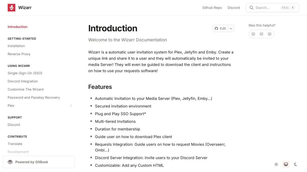 - Request-system integrations (Overseerr, Ombi, etc.), Discord invite support, and customizable HTML snippets for the wizard UI.