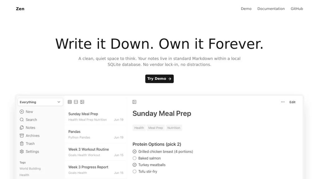 Zen is a simple, lightweight self-hosted notes application designed for fast writing and long-term portability. Notes are stored as standard Markdown files with a local SQLite database for indexing and search.