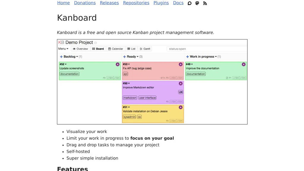 - Issue tracker with labels, milestones, assignees, templates, and project boards