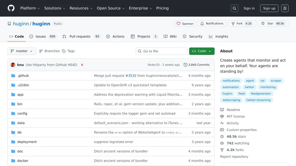 Huginn is a self-hosted automation system for creating “agents” that watch the web and your services, collect and transform data, and trigger actions based on events. It’s often used as an open alternative to IFTTT/Zapier-style workflows, with strong support for web scraping, scheduling, and event chaining.