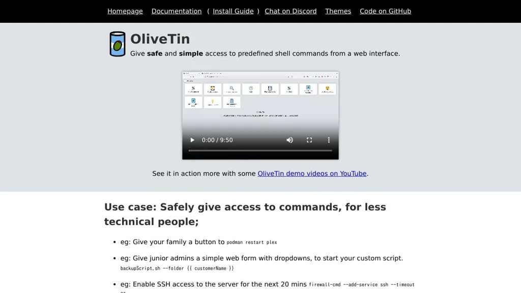 OliveTin provides a web UI to run predefined, audited commands on your server with buttons, inputs, and role-based access—an alternative to ad-hoc SSH.