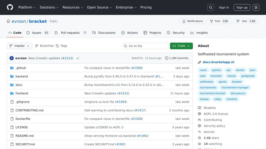 Bracket is a lightweight, self-hosted web application for running tournaments and managing brackets. It focuses on creating tournaments quickly, recording match results, and presenting the bracket to participants in a clear web UI.