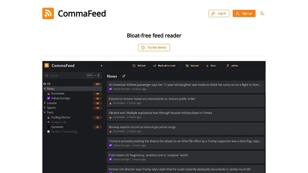 CommaFeed is a self-hosted web-based RSS/Atom reader designed as a lightweight alternative to hosted feed readers. It provides a clean, responsive interface for reading and organizing subscriptions, with features focused on speed, usability, and compatibility with common feed workflows.