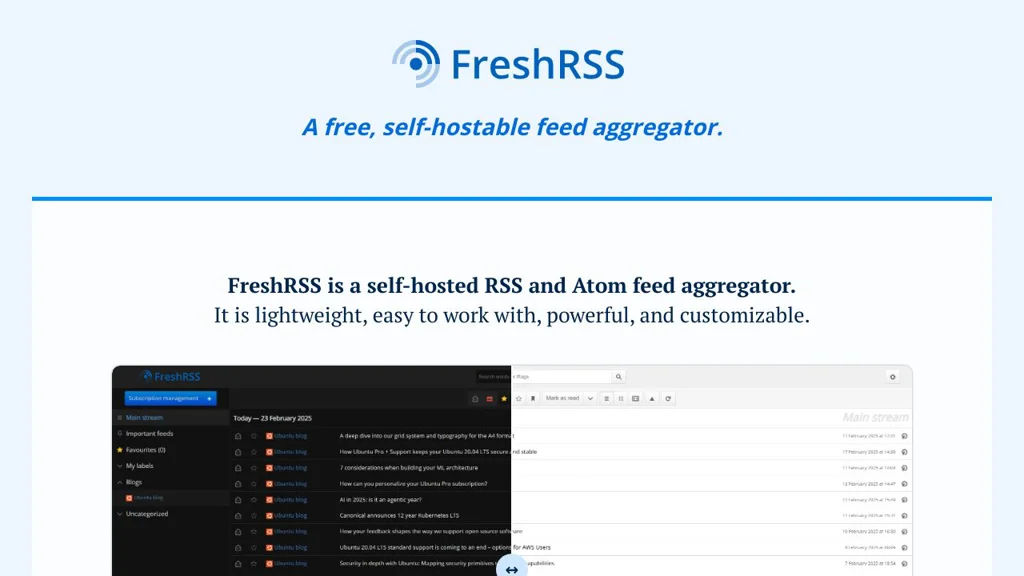 FreshRSS is a mature, widely used RSS/Atom aggregator with an active community and a broad set of organizational and automation features. It is a strong choice for users who want a fast web reader plus compatibility with many third-party feed-reading apps.
