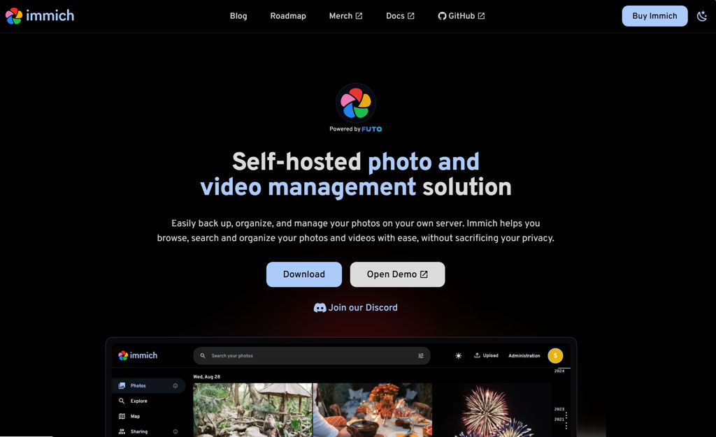 Immich is a self-hosted photo and video management platform focused on automatic backup from mobile devices and fast, modern browsing. It provides a Google Photos–like experience with timeline views, albums, sharing, and machine-learning features for search and organization.