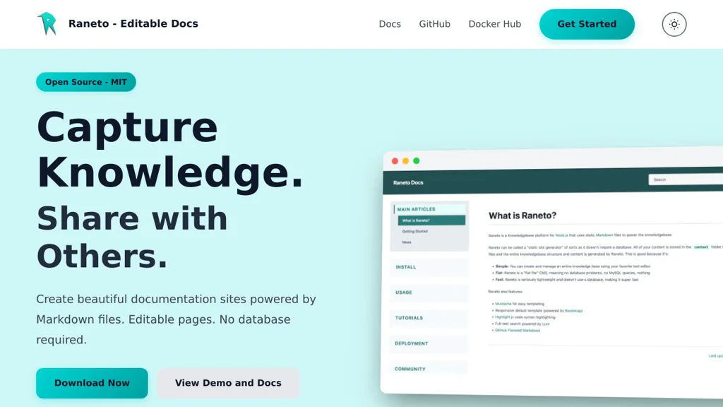 Raneto fits teams that want a minimal, Markdown-first documentation portal that can be versioned with Git and deployed quickly. It is most suitable when simplicity and file-based editing matter more than advanced editorial workflows or enterprise governance.